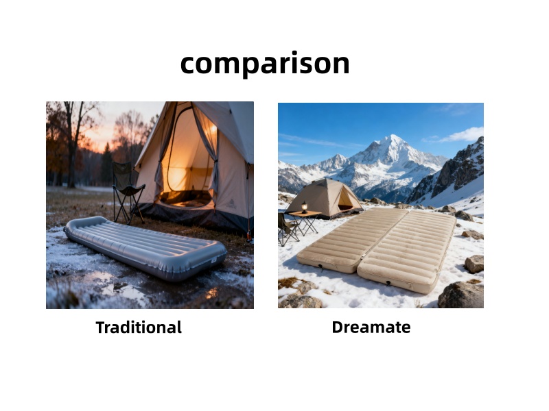 ثانيًا، في البيئات الخارجية الباردة، تُوصل مراتب PVC التقليدية الهواء البارد بسهولة، مما يُشعر المستخدمين بالبرودة. أما Dreamate، فتستخدم مادة TPU عالية الجودة مع عزل داخلي، مما يمنع انتقال البرودة بفعالية من الأرض، ويحافظ على راحة سطح النوم ويجنب الشعور بعدم الراحة الناتج عن اختراق البرودة.