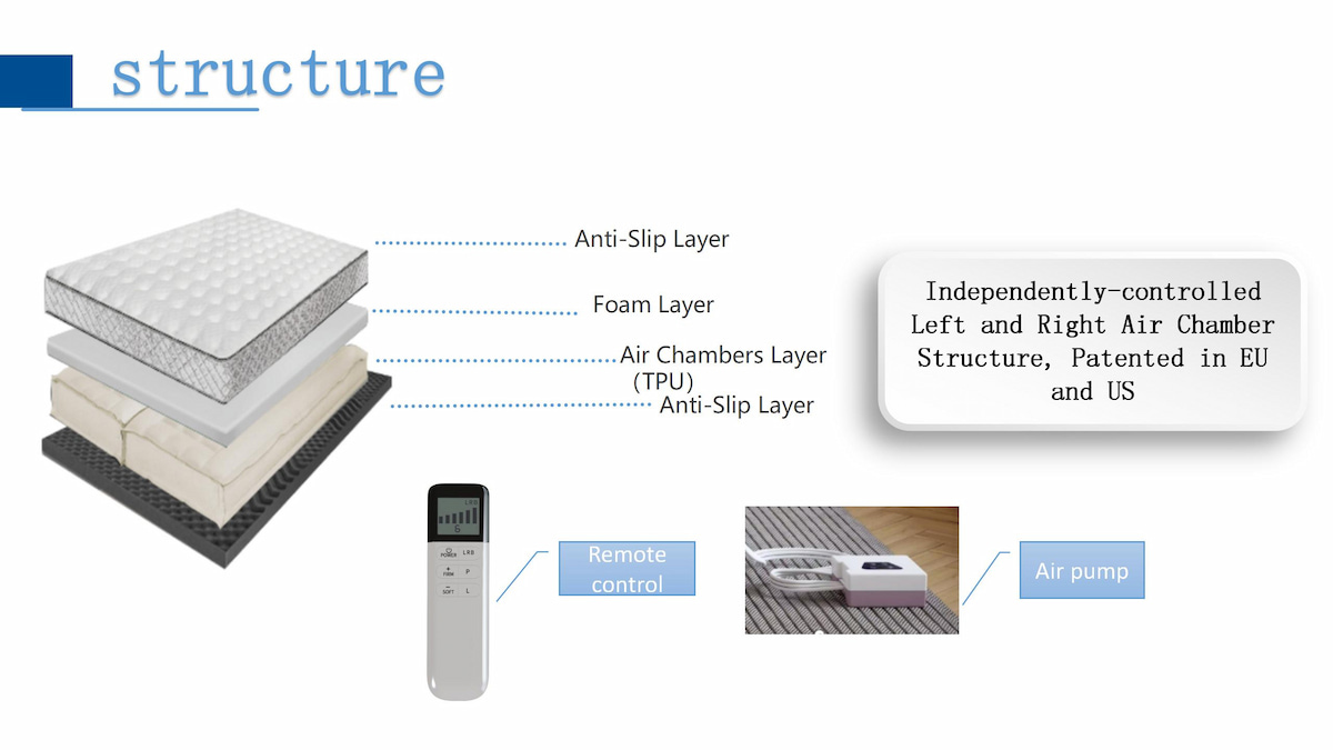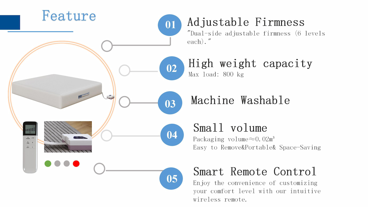 1.5*2*0.35m = 18.5kg 1.8*2*0.35 m=22.5kgتكمن في قلب ابتكار Dreamate في مجال النوم تقنية Air Layered Support الحاصلة على براءة اختراع، وهي تقنية غير مسبوقة مصممة لإعادة تعريف الراحة الشخصية والراحة غير المضطربة.